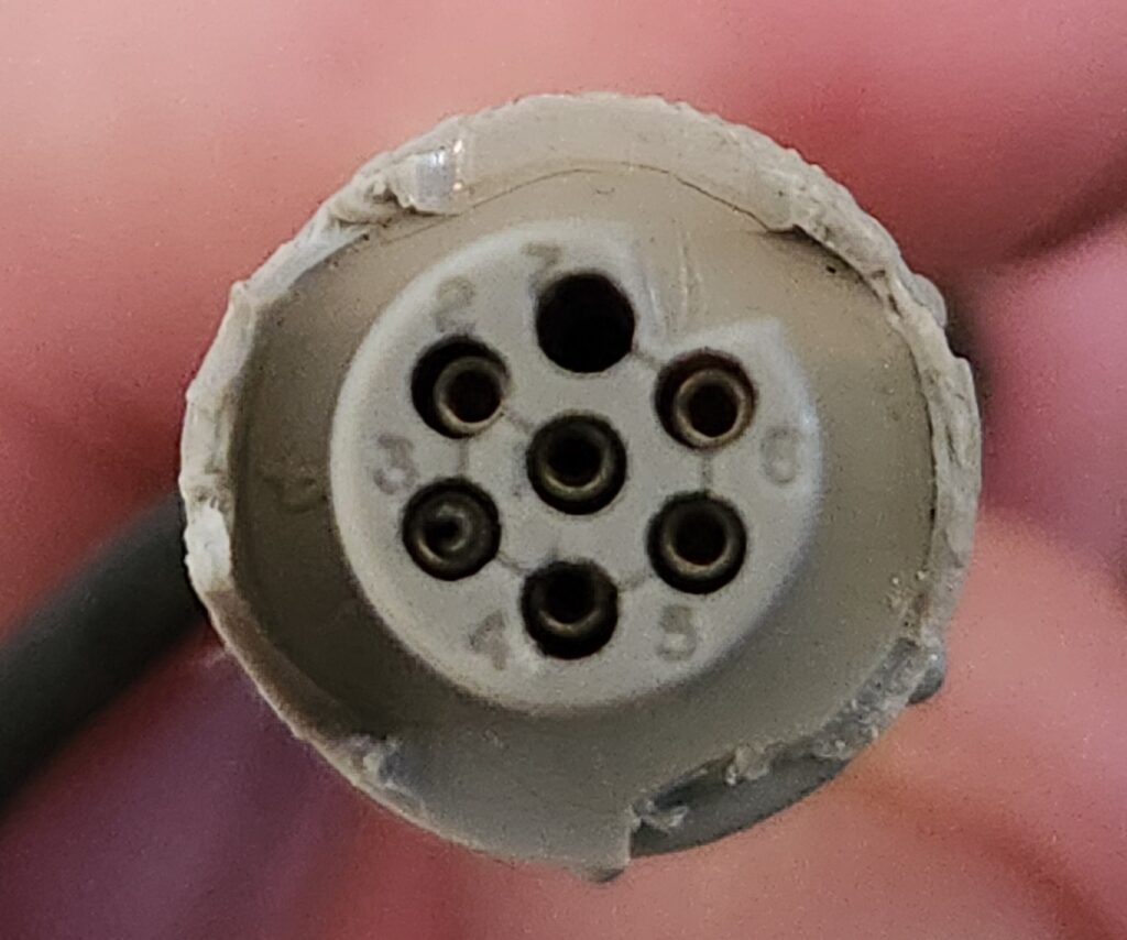 The manual contained all of the schematics for every part of the VT3, including a numbered pin-out. The manufacturers of the connector were kind enough to etch the pin numbers on the face of the socket. As you can see from the picture, the numbering is peculiar, with pin 1 in the center and the rest of the numbers spiraling around it; also, pin 7 is not used. The connections were described as follows: