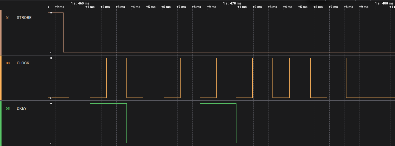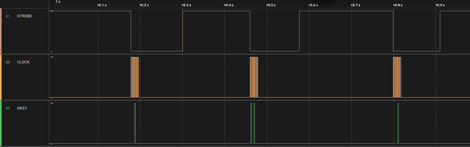 Initially, I wrote a stupidly crude program to make sure that the keyboard was actually working as the manual suggested. It simply monitored the STROBE line watching for a state change, at which point it toggled the CLOCK line, effectively creating a clock train. Meanwhile the DKEY line was monitored for the key code. Here is a logic trace of the keys “a”, “s”, and “d” being pressed.